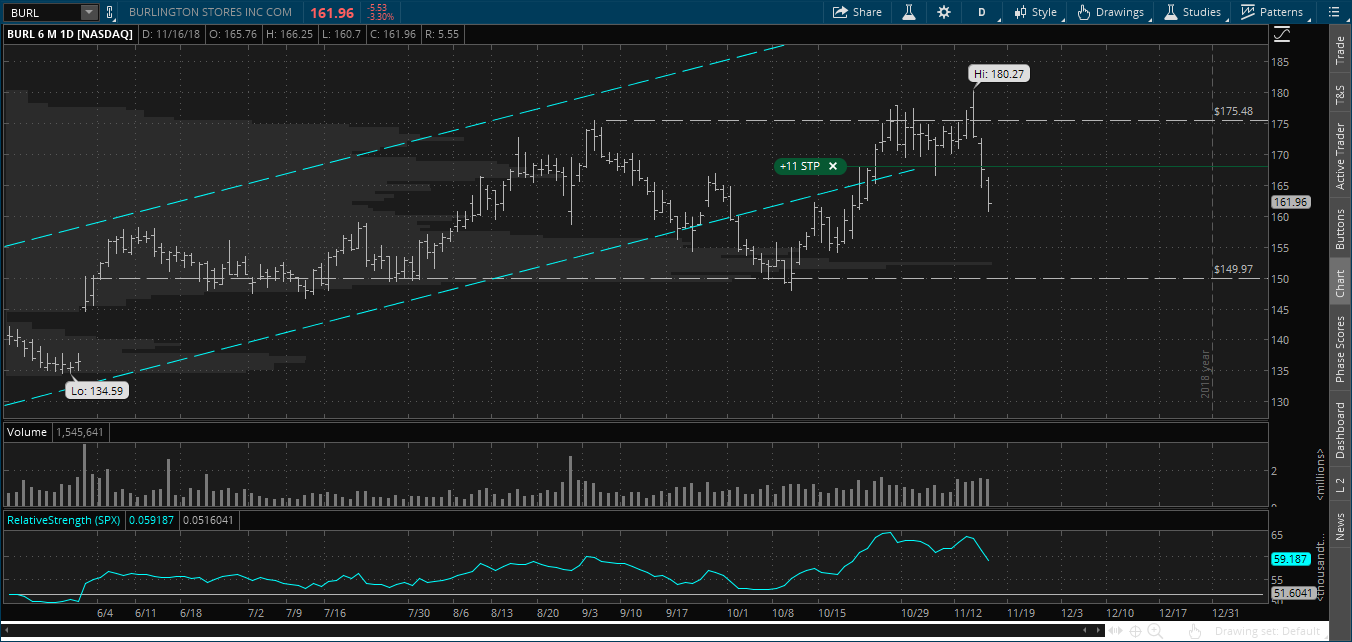 Expanding my horizons a little bit... Been keeping my eye open for quick swing trades after getting burned a couple times trying to time the market, reiterating that ya cant hit em all out of the park..... So here's BURL appearing on a larger time scale to be entering a SSR (stepping stone re-accumulation), and on a shorter time scale printing 3 bearish bars in a row, giving me an opportunity to place a tight stop above yesterdays close, and set sights on a secondary test of the $149 support... Went short this morning just off the high of the day ($163.99), so looking at a potential ~10% gain vs ~2.5% potential loss