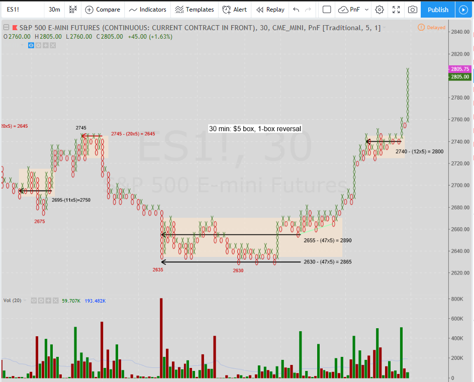 The futures jumped out of the gate printing a tall column of green Xs. I show enough short-term cause (on a 30-minute P&F) to effect a price to 2800. That's already been exceeded by a bit tonight. The base count gives a price objective as high as 2890.