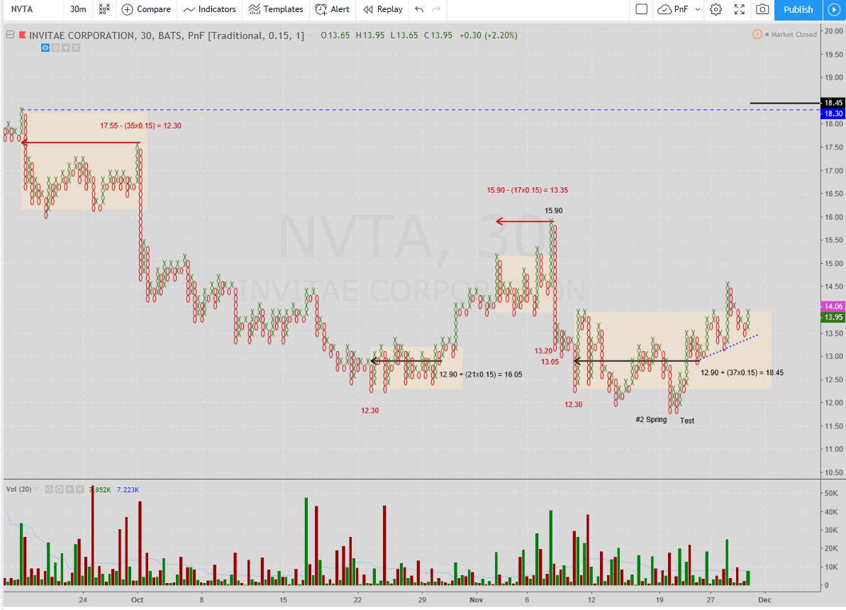 It's good to have you weighing in again Rock. I think your old friend NVTA is ready to retest the September high. Have you been keeping up with it? If so, any thoughts? I went ahead and subscribed to the Pro-Plus plan on Tradingview (even though I'm not a pro) just for the intraday P&F charting capability. Here's NVTA using my new toy showing that after that spring it behaved nicely increasing volume on the up-waves, decreasing down, and an objective of 18.45. 30-min, 15-cent-box, 1-box reversal: