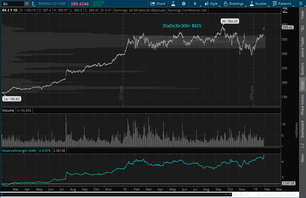 BA is another one on my 60-stock Wyckoff position sheet in the Aerospace group, the leader of that group in fact. BA looks well positioned for significant upside but the group has been a laggard (BA, GD, LMT, NOC, UTX, RTN), however they have been beating the S&P the past week but most have a lot of upside overhead, excepting BA. BA still needs to clear that upthrust high of $394.28 indicated on Jrich's chart.