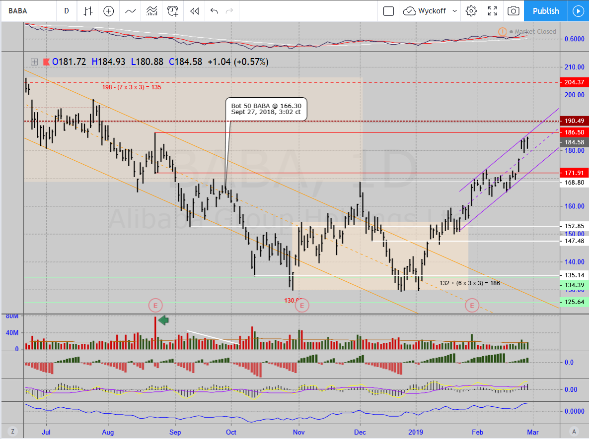 I got pushed underwater on BABA but now breathing better. However, it only has cause to 186 so watching closely as it comes into the 186.50 resistance level and 190.49 axis. Any thoughts guys? Daily bars: