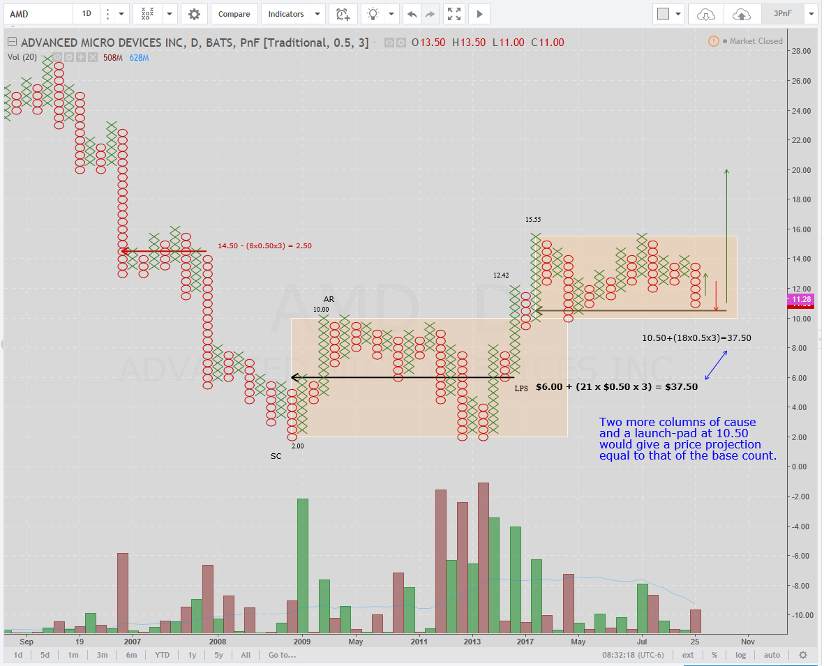 AMD has a base count that projects to a price of $37.50. That cause was built in the lower trading range (TR) shown on point and figure chart below. Note that the TR began back in November 2008. This year, 2017, it has been in a stepping-stone (re-accumulation) TR and it appears some work remains in order to achieve enough cause to project to the same price as the base count; to $37.50. 50-cent-box by 3-box-reversal Point & Figure: