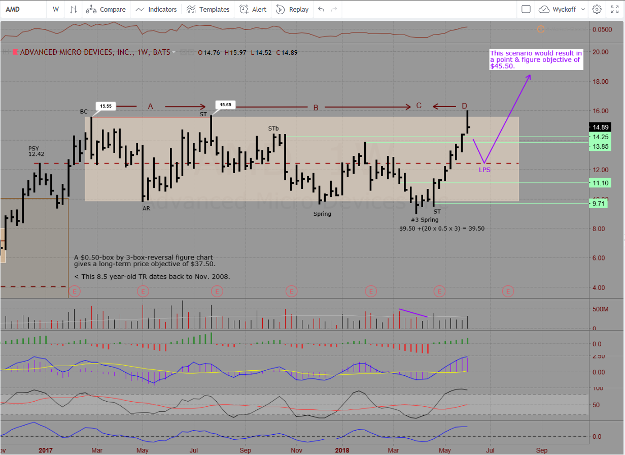 I'm hopeful we'll see a 50% retracement back down to the preliminary supply line (PSY @12.42) which will mark the Last Point of Supply (LPS) and the 2nd best buy point and give a point & figure price objective of $45.50. Weekly chart as of Thursday's close: