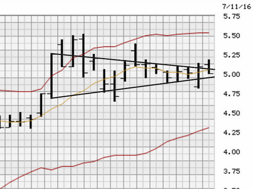 I got a partial fill @.11 trading off my cell but you might have got them for .12, but if it breaks $6 a few cents won't really matter much anyway. AMD has these negative nancy sites like motley fool trying to drive the price down. I won't even bother reading their propaganda. Getting to the trading day the price was pushed down right in the middle of the pennant again on lower volume than it went up on Friday. As yu can see the pennant is getting tighter and in the near term it should pop break to the upside or downside. Ideally I would like to see the price at 5.30 or higher prior to earnings without being overbought. This would give us 8 days after earnings to gain +13% to be in the money on the July 29th $6 calls. So far Lisa Su has delivered, let's hope she pulls out another fact contract, increased market share and a good projection on sales and such
