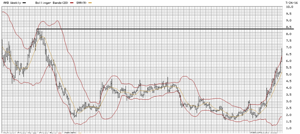 Now that AMD blew through my short term price target of $7 itis time to for a new target. Looking at a 5 year chart it appears that it could be smooth sailing to $8.40. I am going to make this a short/mid term target because it may have went up today due to acquisition speculation. I am sure there was been some offers but most do not pan out. There was one on AMD in 2015 when AMD was almost down for the count. If some company with deep pockets like a Apple wants to buy I would be good with a $10 to $14 exit price and maybe some shares of the said stock. With that the Short-Term/Mid-Term target is $8.40 and the long term target is still $9.75