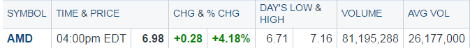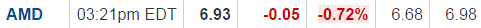 The mini- bounce was short lived but still gained 10 cents from it. Here is what is good about the drop today, it was on much lower volume than when it went up the last 3 days. Considering the run AMD has had it should have dropped much lower. It finished in sync with the market which is also a good thing. This does not mean it could not go lower as it is still overbought. I like the chances of a much higher price in the near term