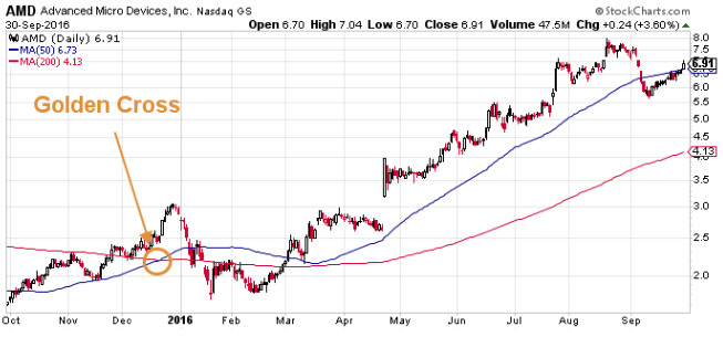 This is not my chart as AMD has been scratching and clawing it's way back up The golden cross is a bullish breakout pattern formed from a crossover involving a security's short-term moving average (such as the 15-day moving average) breaking above its long-term moving average (such as 50-day moving average) or resistance level.
