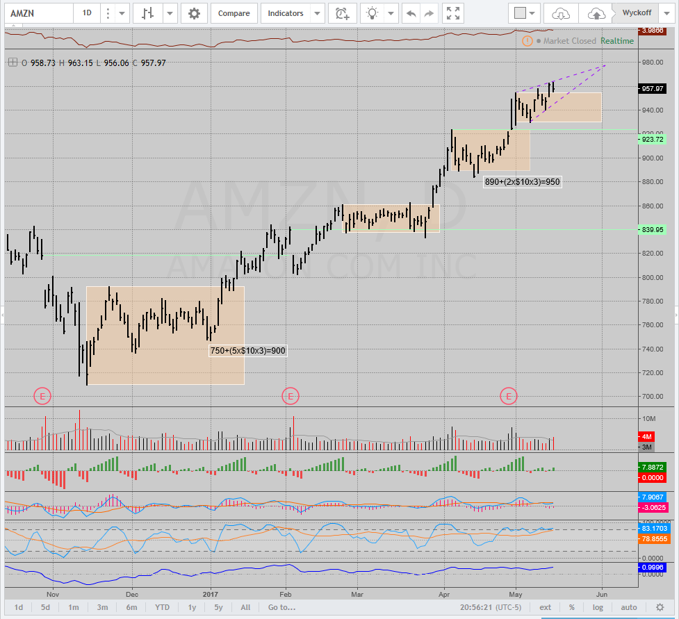 Over-valued, over-bought, yeah I suppose you could say that. I prefer to think of it as running out of "cause"....as in "cause and effect". The smart money buys in a trading range (builds cause) then allows the public to mark it up (effect). The amount of the "cause" represents the smart-money commitment which in turn determines the effect. So yeah it has over run its estimated effect, but it appears to do that routinely....dang cult stock. My thinking is this little upthrust is distribution and will fail. The cause built during distribution (the number of ups and downs in the trading range) will determine the effect of the fall. Of course the trading range could be re-accumulation....sickening thought I know, but trend is up, and trend is everything. Supply will need to prove itself with a sign of weakness. Can you tell I dislike AMZN?