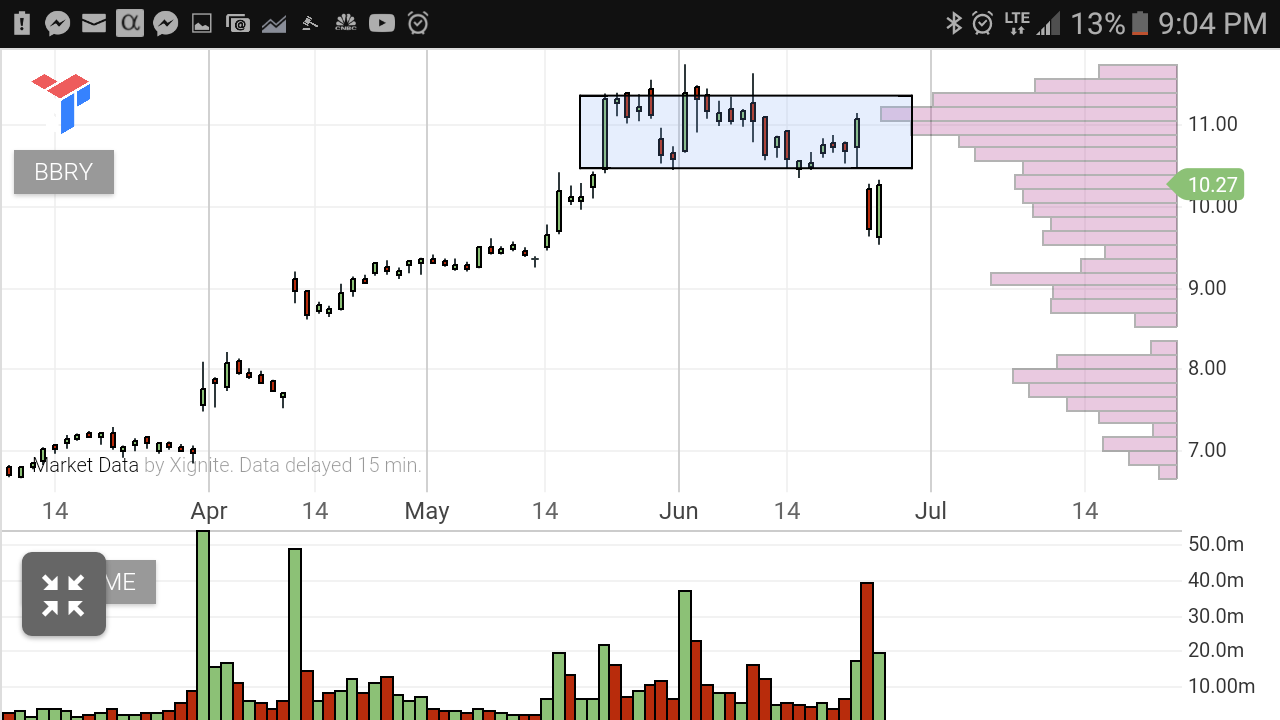 Have you ever tried watching a football game on TV while listening to the same game on the radio??... Spoiler, its not much fun that way... Since the FM waves radiate strait to your radio antenna, and the TV signal has to bounce off a bunch of satellites, theres a delay between the two... so you hear the touchdown before you see it..... almost like looking into the future.... creepy! But what if you could make bets on that delay... if you knew the field goal was good before the ball was ever kicked... that would be fun right??? Im curious to see if the relationship between these two charts is similar to that scenario Far as i know, these two stocks have absolutely nothing to do with each other... so whats with the synchronization???....... who knows, could be aliens for all i care (the real FOREX!).... all that matters is if this unidentified pattern keeps flying I know.... silly trade.... what are the odds of BBRY gaining 50% just cause some other stock with a similar chart did...... well..... what are the odds after making the same moves 4 times in a row that it would stop at 5??? This is the arguement i had with myself this morning.... by the time a talked myself into it, i got in at $10.03......... lets see where the rabbit hole goes