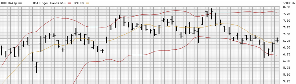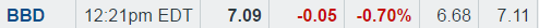BBD showing strength today and only up 3 cents. If the markets should reverse their losses I expect BBD to climb higher. Currently $7