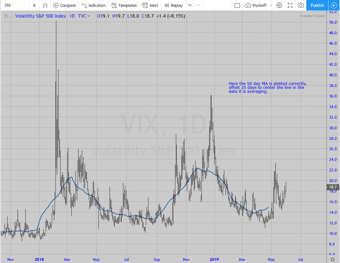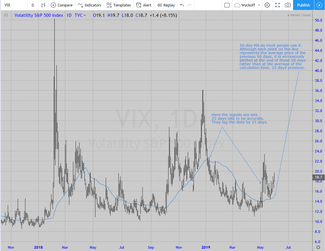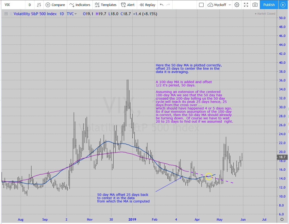 It's a problem with using Moving Averages in general. They lag the data by 1/2 of their period. For example, the 50-day MA is 25 days old. Yet the conventional way of plotting is to assume the last point on the line is current. It's not. A 50-day MA should be plotted 25 days previous. Using the VIX example, here is the conventional way to plot the 50-day MA: But below is how it should be plotted with an offset 25 days into the past so that each point on the line represents 25 prices before it and 25 prices after it: There is an interesting mathematical phenomenon that is sometimes useful. If you combine 2 moving averages with one twice the length of the other, say the 50- and 100-day MAs both offset by 1/2 their respective periods, then where they cross is exactly 1/2 the move in amplitude and time of the shorter MA. It is useful because knowing where they cross allows you to predict when the up- or down-cycle has ended for the shorter MA. The problem is though, that you have to assume an extension for the longer MA to find that cross over. Another problem is that they both might start trending...the MA's run together. JM Hurst has a book on this topic. He was a cycle guy back in the 1960s when cycle analysis worked, when the market was allowed to be cyclical. Of course now we have a centralized economy vis-a-vis, the Fed.