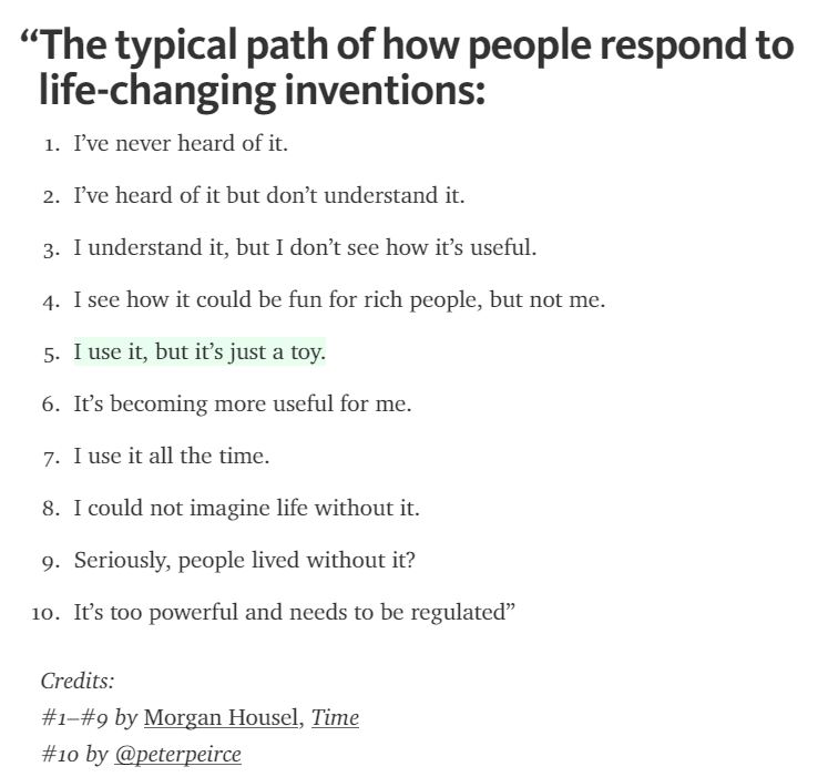 I believe that Bitcoin is here to stay in this world. I have been a bitcoin advocate since after the first runup (actually third) into the 1000's when I really started to research it. Once it pulled back and held 200-250 there was ALOT of buyer Support there. Every single bad event has been bought up and now we took out the old highs. I posted the photo above because I thought it was an interesting thought process of how "change" and new inventions are accepted. Of course the mass is not going to believe in it or want it at first, but once it hits the tipping point and everyone understands that will be no return IMO.