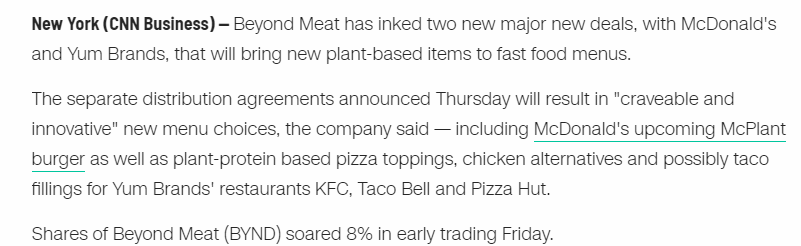 One of my concerns with beyond meat is I don't see a barrier of entry into the industry nor do I see a lot of franchise value. I just had a burger Patty made from minced mushrooms and other organic stuff. It tasted less meaty than a beyond meat burger, which is already less meaty than beef, but it was just as delicious as bm and it wasn't loaded with sodium. It was a small shop where guys with man buns go to eat along side women who are into the arts. The point is, this small shop whipped up this burger themselves from raw ingredients and it was an excellent burger experience. They didn't need beyond meat to productize minced vegetables and seasoning. I believe there is a place for beyond meat but I don't see it as a log term, high margin, field of operation.
