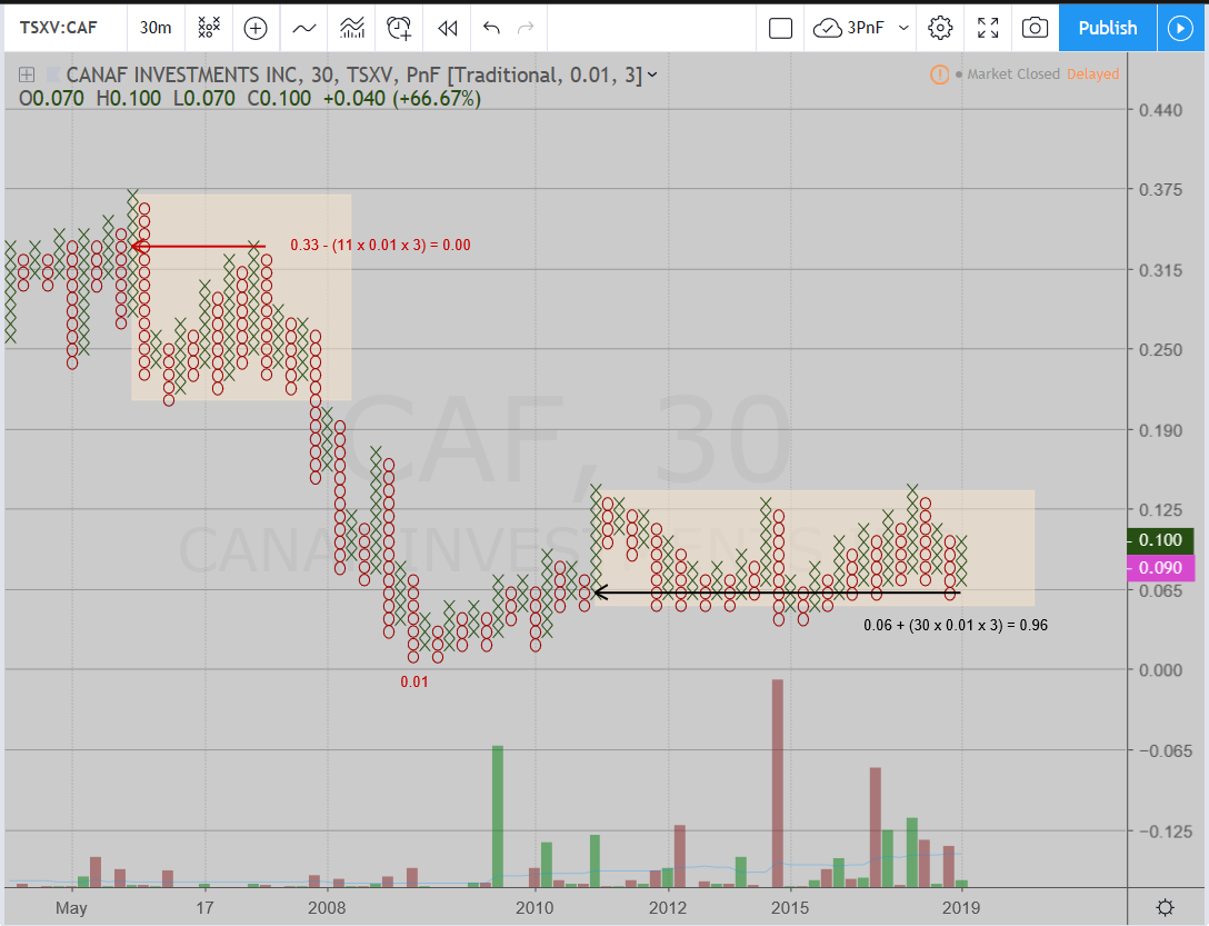 It may not be too much longer. As of now, based on a one-cent-box by 3-box-reversal point & figure count, CAF has enough fuel in the tank for a move to 96 cents, a 967% move, a near 10-bagger.