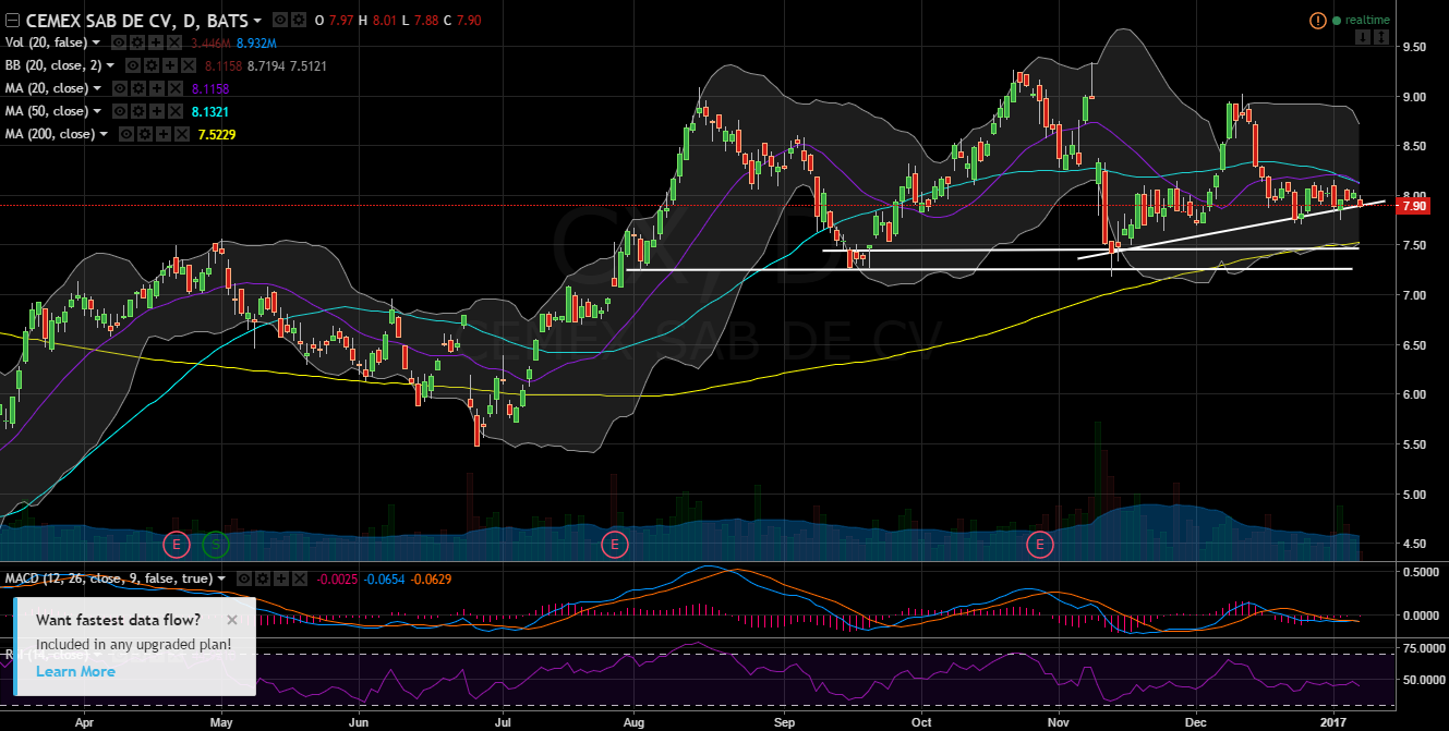 CX pulled back today probably on the Trump/Mexico meeting being canceled in regards to the Wall in addition of the Dollar being strong today. If the Wall can stay in limbo for awhile we might get a good entry on CX. Even if the wall is never built it is still a good company.