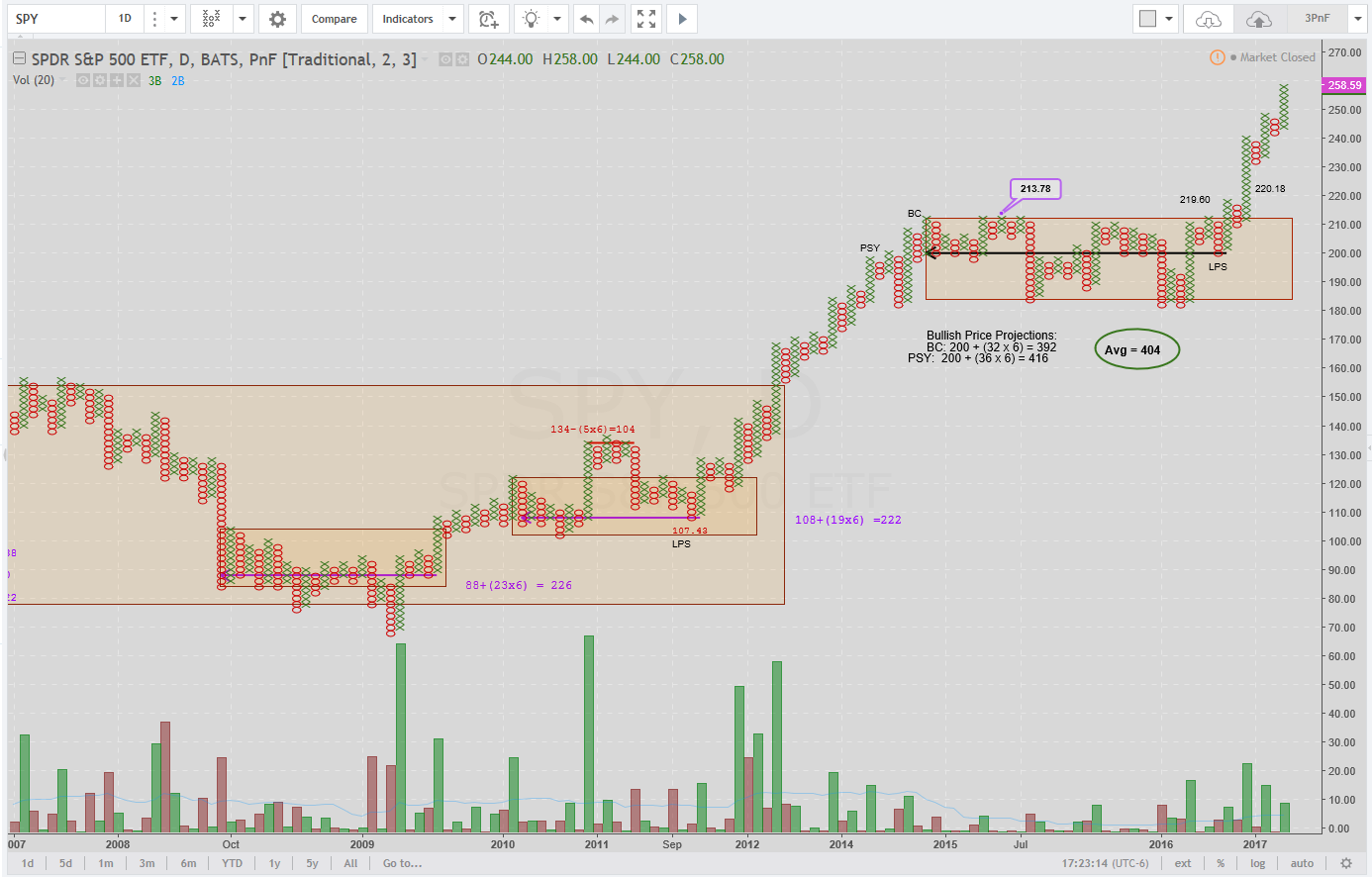 Time to update the SPY projection of $404 (average of 392 and 416) made back in Nov 2017 (chart above). Changing the box size from $2 to $3 (to account for the higher price level) and assuming we retrace back to about $267 the new re-accumulation count gives a bullish projection to $447. $3-box by 3-box-reversal Point & Figure: