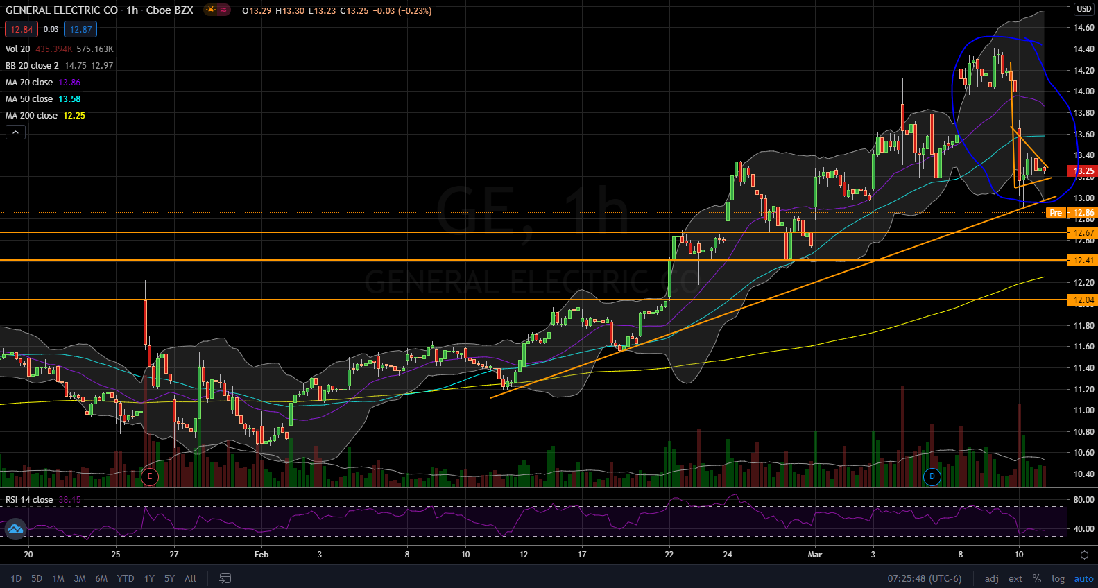 Hourly chart. If this bear flag pops, these would be the support levels I'd be watching. $12.67, $12.41, $12.04.