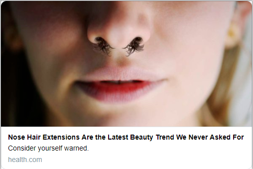 Maybe we need to start a "mental health concern" thread.... Nose Hair Extensions Are the Latest Beauty Trend We Never Asked For https://www.health.com/beauty/nose-hair-extensions