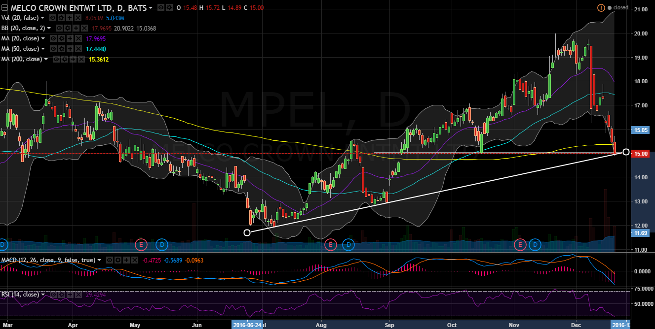 With this I am looking forward to the ER and no profit taking until I am locked in to the yield Melco Crown Entertainment (MPEL) Declares $1.3212 Special Dividend; 7.9% Yield; Amends Dividend Policy Melco Crown Entertainment (NASDAQ: MPEL) declared a special dividend of $1.3212 per share. The dividend will be payable on February 10, 2017, to stockholders of record on January 23, 2017, with an ex-dividend date of January 19, 2017. The annual yield on the dividend is 7.9 percent. http://www.streetinsider.com/Corpor...%+Yield;+Amends+Dividend+Policy/12419303.html