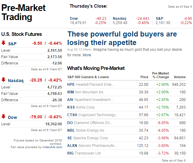 Good morning Stockaholics! Happy TGIF! Frontrunning: September 9 German jitters weigh on stocks, ECB doubts lift yields (Reuters) Chinese Billionaire Linked to Giant Aluminum Stockpile in Mexican Desert (WSJ) Monte dei Paschi CEO to be replaced as cash call looms (Reuters) German exports plummet in July, hit trade surplus (MW) North Korea conducts fifth and largest nuclear test (Reuters) Hedge Fund and Cybersecurity Firm Team Up to Short-Sell Device Maker (NYT) Lavrov, Kerry express concern after latest North Korea nuclear test (Reuters) There's a Simple Reason Why UBS is Hiring So Many Quants (BBG) Iranian oil output stagnates for third month amid OPEC bargaining (Reuters) It’s Tough Being Over 40 in Silicon Valley (BBG) Elon Musk’s SpaceX Explosion Most Vexing Failure in 14 Years (BBG) Barroso's Goldman job hits post-Brexit EU as it battles for trust (Reuters) From steaks to furniture, Hanjin Shipping collapse to raise freight costs (Reuters) Ford Stock Stubbornly Sinks as Bosses Try to Rally Investors (BBG) Duterte says he told Obama he never insulted him, thinks U.N.'s Ban a fool (Reuters) It’s Millionaire Versus Billionaire in Beverly Hills Tower Spat (BBG) David Geffen’s New York City Apartment Seeks $27.5 Million (WSJ) STOCK FUTURES NOW: YESTERDAY'S MARKET HEAT MAP: TODAY'S ECONOMIC CALENDAR: MOST ACTIVE TRENDING PRE-MARKET DISCUSSIONS (SYMBOLS ARE CLICKABLE!): UVXY KR SPY LXRX FNSR JNUG WFC NUGT GWPH WATT AAPL CHK ACHN JDST RH DGAZ LNTH HIT TLT NVAX OCLR TTM XIV APH TODAY'S EARNINGS CALENDAR: THIS MORNING'S PRE-MARKET NEWS MOVERS: RG, JPM, CMG, TWTR, WMB, HPQ, RCL & more... source: cnbc.com Restoration Hardware — The retailer of luxury home goods reported adjusted quarterly profit of 44 cents per share, 15 cents a share above estimates. Revenue was also above forecasts, although the company does point out that much of the beat was due to being able to ship products earlier than anticipated. That moved a portion of revenue and earnings forward into the most recent quarter. JPMorgan Chase — Macquarie downgraded the bank's shares to "neutral" from "outperform," citing valuation, a challenging interest rate environment, and higher capital buffer requirements than its peers. Mattress Firm — The mattress retailer reported adjusted quarterly earnings of 57 cents per share, 8 cents a share below forecasts. Revenue also fell shy of estimates. Comparable-store sales fell 1.1 percent during the quarter, but the company said it is making good progress in integrating its purchase of the Sleepy's chain. Chipotle Mexican Grill — Chipotle settled cases with more than 100 customers who became ill after eating at the restaurant chain, according to lawyers for those customers. Terms of the settlements were confidential. Twitter — Twitter remains in the news, amid speculation about its future. The New York Post reports that, contrary to rumor, investor Carl Icahn is not building a stake in the company. CNBC had reported earlier this week that no bids have come in for Twitter. Williams Cos. — Williams shares are under pressure, following news that rival pipeline company Enterprise Products Partners is no longer interested in a merger with Williams. Enterprise said it did approach Williams about a potential deal, but found there was "no actionable path forward." Korn/Ferry International — Korn/Ferry reported adjusted profit of 52 cents per share for its first quarter, 1 cent a share below estimates. The executive recruiter's revenue also fell below Street forecasts. Its current-quarter forecast is above consensus estimates, however, as it benefits from its recent acquisition of human resources consulting firm Hay Group. Deutsche Bank — Deutsche Bank is expected to settle U.S. mortgage-backed securities cases for more than $2.4 billion, according to a German magazine, which said the Justice Department will send a formal notice to the bank next week. Finisar — Finisar reported adjusted quarterly profit of 38 cents per share, 8 cents a share above estimates. Revenue also beat forecasts. The fiber optics company also gave a stronger-than-expected current-quarter forecast, as cloud services companies increasingly upgrade their networking hardware. Advanced Micro Devices — AMD priced its recently announced secondary stock share offering at $6 per share, raising $600 million, compared with the originally expected $450 million. The chipmaker's $700 million offering of convertible notes also priced, with the initial conversion price at $8 per share. HP Inc. — Samsung Electronics is considering selling its printer business to the former Hewlett-Packard, according to the Seoul Economic Dailynewspaper. Royal Caribbean, Norwegian Cruise Line — Bernstein began coverage on the two cruise line operators with an "outperform" rating, saying it is bullish on the cruise industry in general because it is concentrated on relatively few players and has strong demand characteristics, among other factors. Zumiez — The action sports apparel seller reported a quarterly loss of 3 cents per share, 5 cents a share smaller than anticipated. Revenue was in line with forecasts. Zumiez does say its overall business continues to underperform its expectations, and it is focusing on managing its expense structure and executing its long-term plan. Good trading day to everyone in here on this Friday!