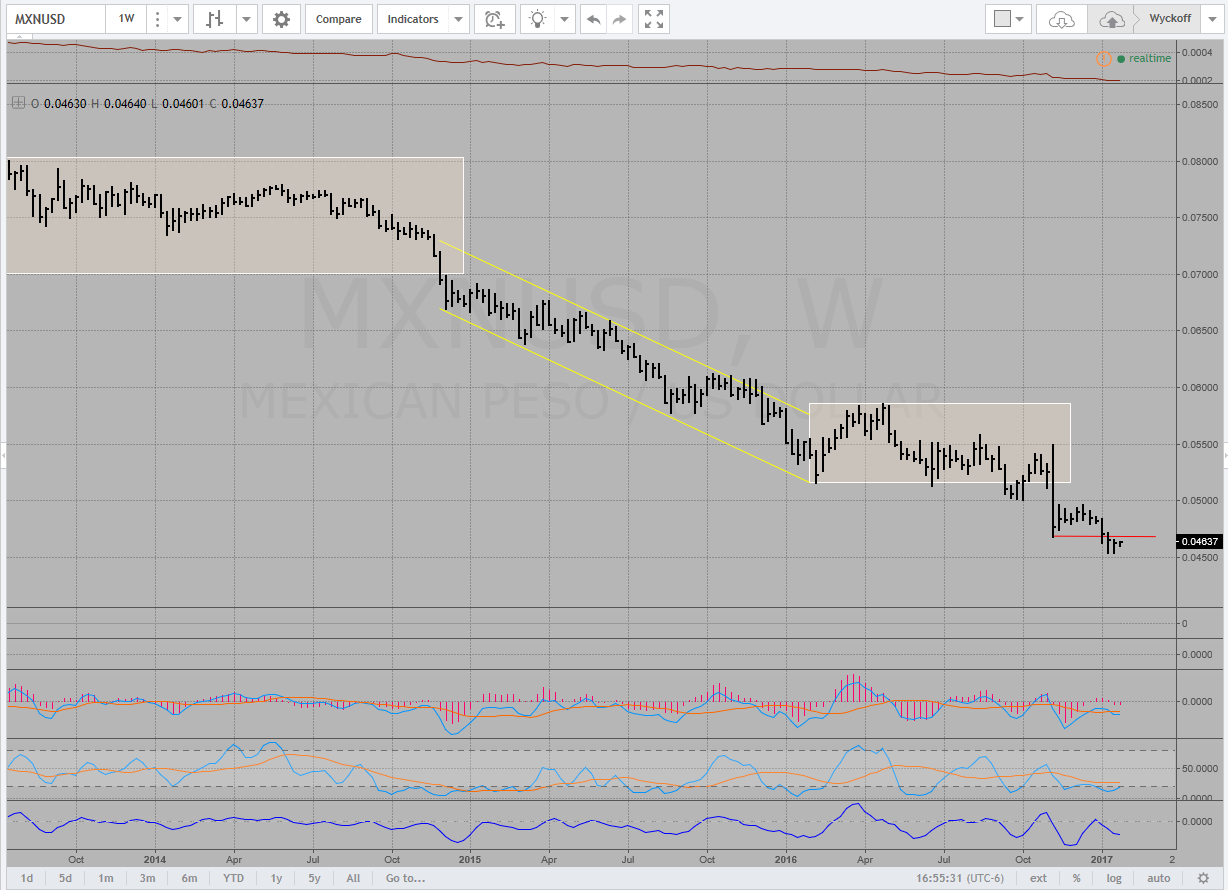 Just to clarify, your chart above is the USD priced in MXN; it shows about 21.55 pesos to purchase one USD. So when you ask would I short the peso; you are asking if I would go long your chart; would I go long the USD/MXN. Apparently you think the broadening pattern you've drawn has significance and the USD/MXN will honor your supply line and go down, and thus the MXN will rise against the dollar. Let us say the MXN will bounce higher. That would be a positive to dollar-denominated trading accounts holding the EWW but the components of the EWW may not fare too well in a rising MXN environment. It's a double-edged sword. But just to focus on the MXN, below is the inverse of your chart, the MXN/USD weekly bars. I just don't see any broadening trend lines on my chart. Looks like an orderly continuation of the downtrend to me.