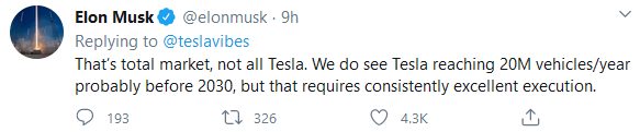 Keep in mind, you will watch over the next few years, several car manufacturers suffering to the point of collapse or desperate mergers. There will be a vacuum developing rather quickly, and there will be survivors, and there will be Tesla. Ample room for growth acceleration for Tesla. I watch Ford now, desperate to team up with VW to be a viable EV company. Which it will not be. Chrysler, Cerberus should have hacked it to pieces like a junkyard car. But somehow they survive by being tossed around by new parent companies. A lot of their product is really poorly designed. VW, they just keep messing up since diesel gate. At least they got Ford giving them use of their unused plants. Yes, Tesla can achieve 20m cars, with customers in line. Fleet. Rentals. Ride shares. And a 25k$ EV commuter could be sold in mass in many countries. Yes, other car companies are projecting a contracting market for them. Thanks Elon
