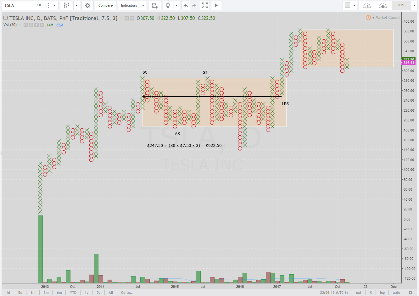 Well as shown, the $922.50 target is based on a point and figure chart which by the nature of its construction has no "time" element. Time is in essence filtered out which has its advantages for identifying "cause and effect" or put another way "accumulation and mark-up" or "distribution and mark-down". But alas, without time, it can't predict how long it will take to get there. For that you need to use a vertical chart (bar chart, candlestick chart, etc). After the mark-up is established you can estimate the time by measuring the stride, that is, the slope of the trend.