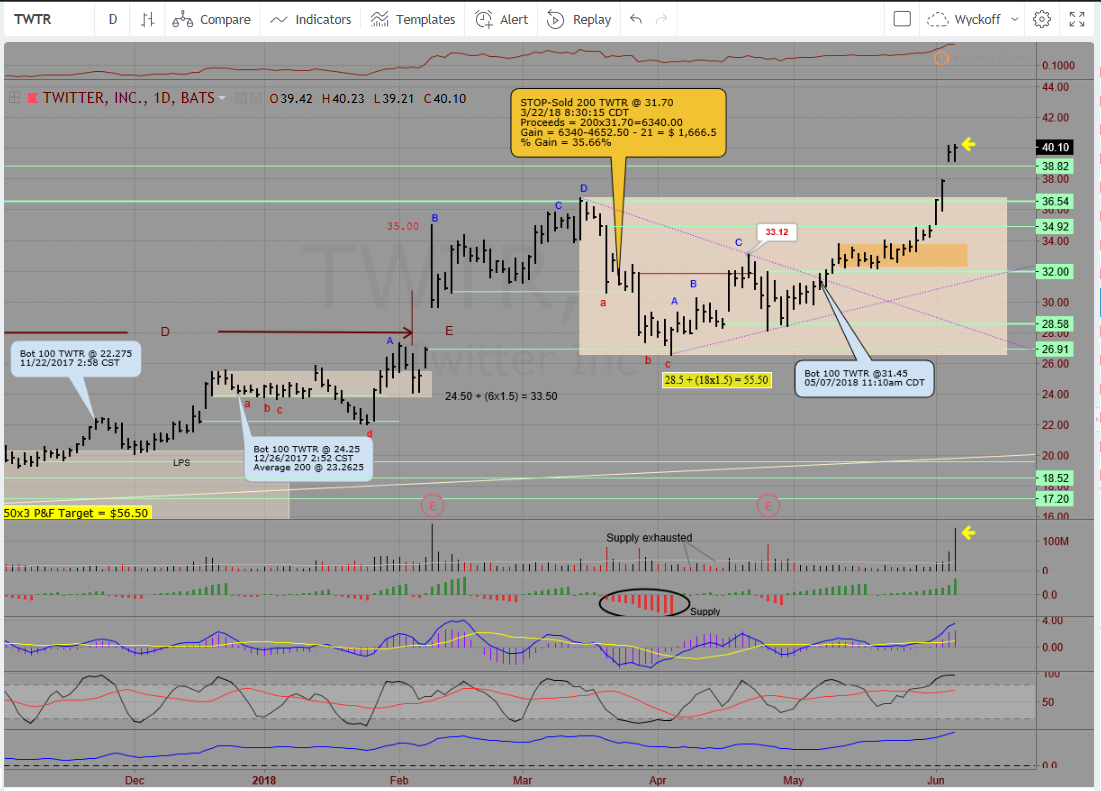 I sold today. My re-entry was 500 shares back at $30.81 on 5/1/2018. Exited at $47.00. The chart below shows the volume profile of TWTR after it's IPO thru July 2017 before the breakdown. As you can see this rally just barely missed the VAH (Value Area High) at $48.25, which happened to be my target. I saw a 153,000 share order on the ask at $47.70 earlier this morning and it became clear to me that some significant supply was now hitting the market At this point it was just too much for to risk a significant pullback and park my money. This IRA is now up 31.3% on the year 92% since 1/2016 as I continue to build it. Good luck to you much longer term guys - I still feel you have a gem here.