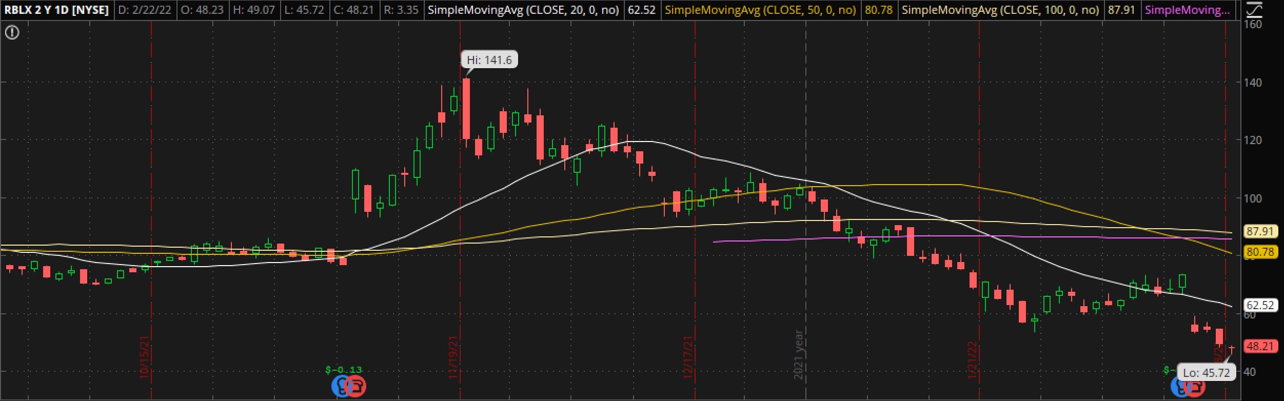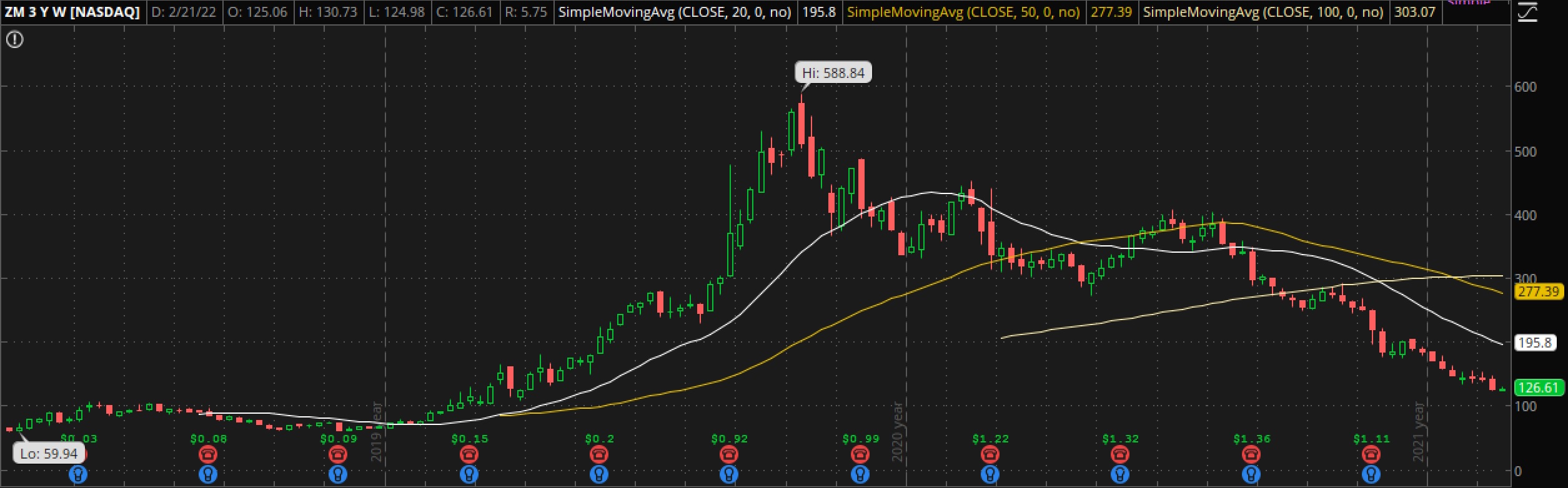 My first IWM credit spread for this week expired OTM +1.83% Didn't even try to get any of my weekly covered calls filled...I would've had to bring the strikes way down to get filled & given the chance of a run-up on seemingly any good news related to geopolitics or rates, I thought it too risky! I did get into a ton of swing trades today, however. Too many to post all at once, honestly, and very small positions (1% of my portfolio or less). I'll begin to work through them over the next few days so they are all laid out here. First up: ZM. There isn't a ton of analysis (which is why I'm starting off here!) beyond the fact ZM is down massively but approaching where the epic rise all began around that $100 mark. I'll continue to nibble at this down to $100, but if there is a continued move below $100 then I'll bail. This swing trade boils down to the fact there is so much room for upside, with comparatively limited room for downside. To be clear, I am not saying ZM is a investment for the long term, but I do believe once geopolitics and rates stop affecting the markets in the ways I believe they currently are, we could see a pop here before more downside. I have similar feelings about RBLX -- just a massive fall from grace. This is a swing trade to see if we can get a gap-fill into the 60s. Since there is not a lot of technical data at these levels...an my target is the gap fill...I will keep my stop tighter here to only in the 30s. Thanks for stopping by, V