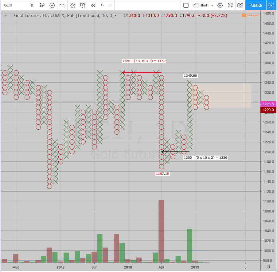 Gold used up its cause built in the 1200s range and hit the price projection. It is now building cause between 1280 and 1350. Since it has strength in the background, must assume this new range is re-accumulation and the uptrend will continue once the Composite Man is done re-accumulating. $10-box by 3-box-reversal Point and Figure: