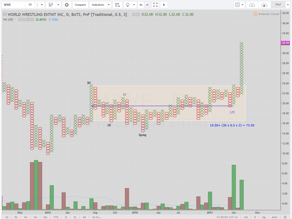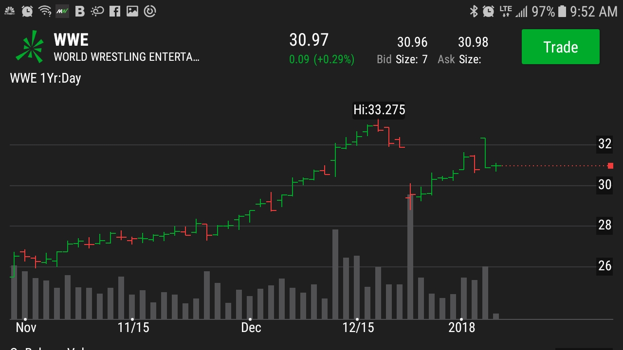 Just think, you probably own a portion of the very shares that Vince McMahon once owned and sold to the boiler room at $28.68. Careful though, your wrestling with the pros on this one. Remember Andy Kaufman's short wrestling career? The all time high is at round number $34.00.